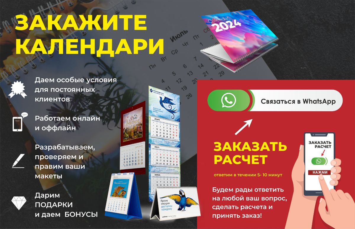 Не откладывайте заказ печати календарей на потом - свяжитесь с нами уже сегодня, чтобы получить тираж вовремя и убедиться в качестве нашей работы!