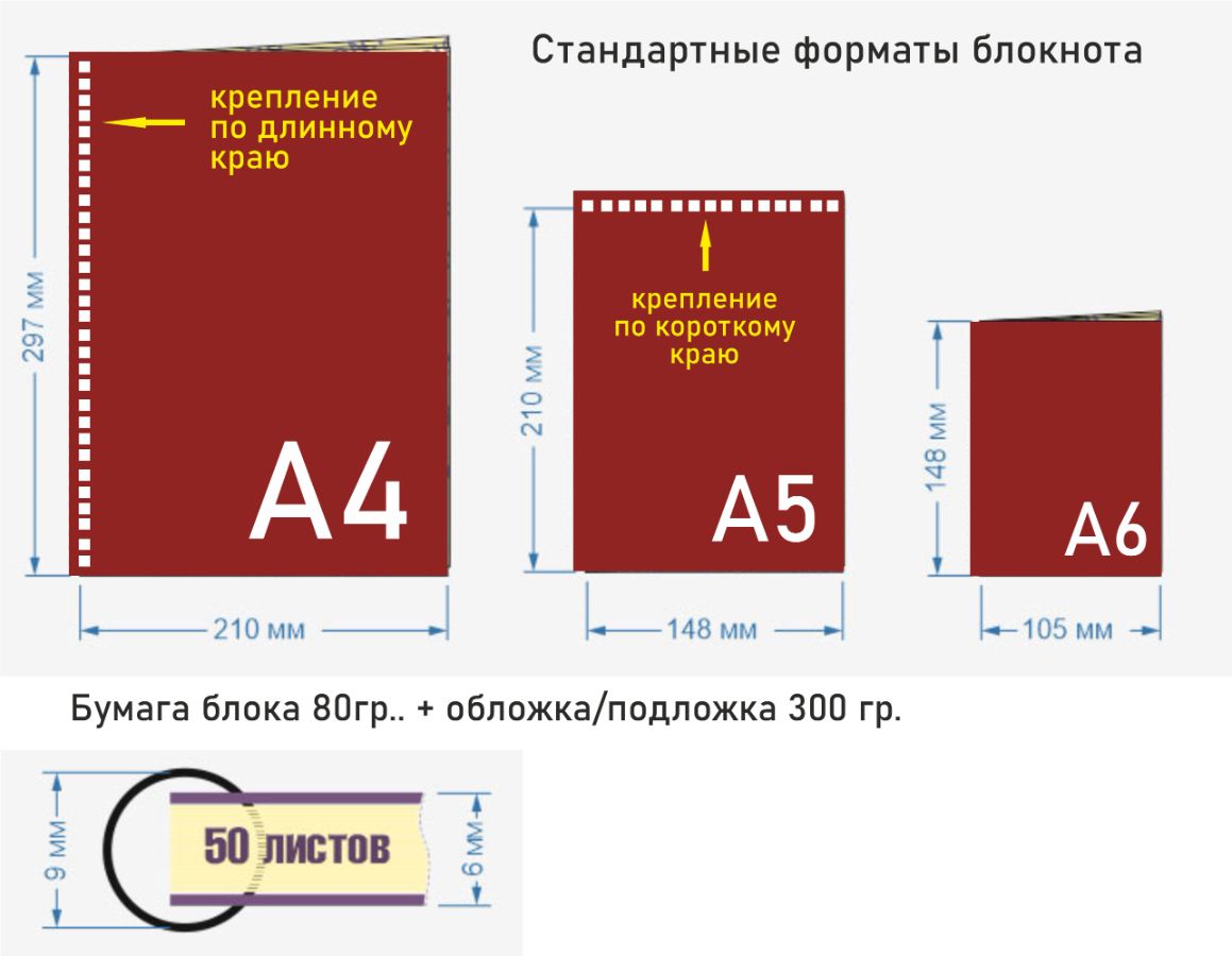 Стандартные размеры: А6, А5, А4.